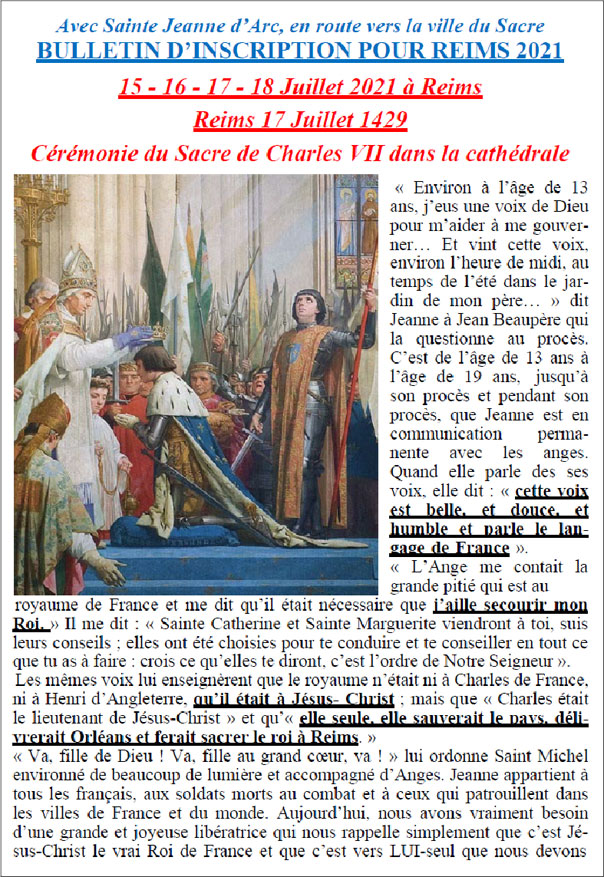 - 15 / 16 / 17 / 18 juillet : 4 jours de rencontres - prières - témoignages à Reims sur les pas de Jeanne d’Arc - S’inscrire en écrivant à l’association - 3 rue des Mirabelliers 85340 Les Sables d’Olonne.